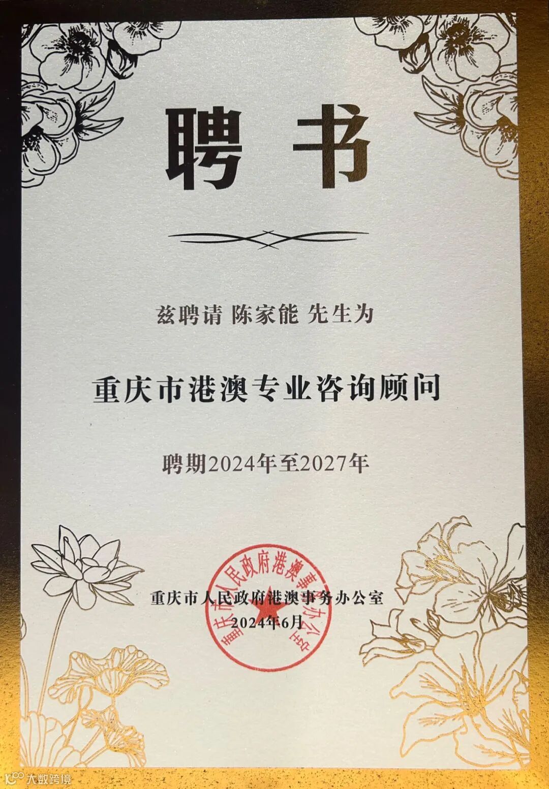 为推动渝港、渝澳深度合作,打造多元开放的国际交往枢纽,6月20日,2024重庆市港澳顾问年会在渝开幕,推动渝港澳合作再上新台阶。重庆市政府副市长张国智出席并致辞。何超琼等15人受聘为重庆市港澳顾问。广信君达律师事务所粤港澳大湾区律师陈家能获聘为重庆市港澳专业咨询顾问。