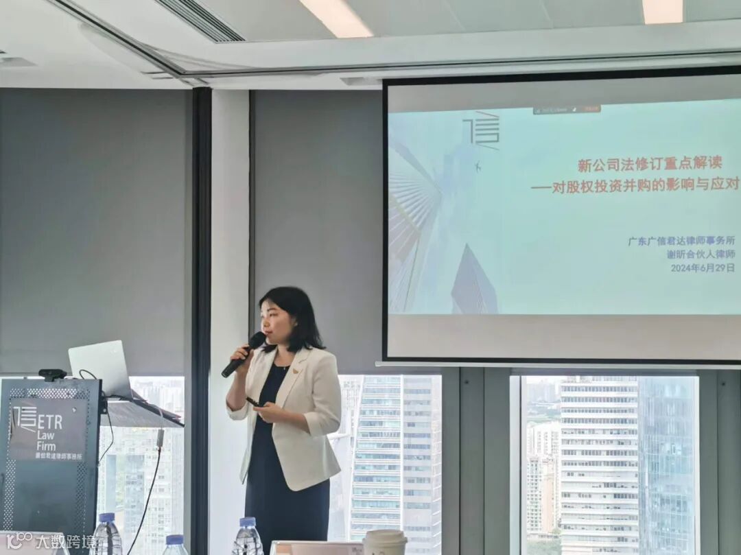 2024年6月29日上午,为正确适用2023年12月29日第十四届全国人民代表大会常务委员会第七次会议第二次修订的《中华人民共和国公司法》(简称“《公司法》”),广信君达律师事务所投融资法律专业部、公司法律专业部与广东省哈尔滨工程大学校友会联合举办的“新《公司法》修订重点解读——对股权投资并购的影响与应对”专题讲座在本所成功举办。