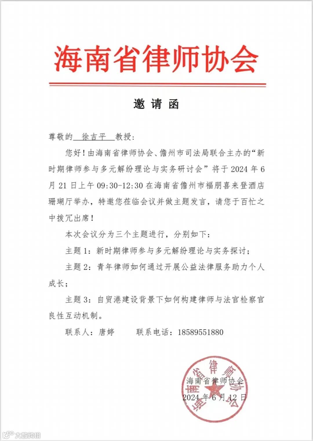日前,由海南省律师协会、儋州市司法局主办,海南省律师协会儋州工作站、上海政法学院调解学院承办的“聚焦多元解纷 探索诉源治理——新时期律师参与多元解纷理论与实务研讨会”,在海南省儋州市圆满举行。来自全国高等院校、科研机构、司法机关、党委政府部门、法律服务机构65位嘉宾受邀出席,其中,广信君达(上海)律师事务所(简称“广信君达上海分所”)执行主任徐吉平律师受邀参会并做主旨发言。