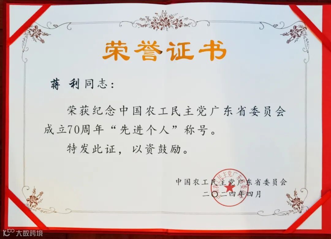 本所蒋利律师获评“农工党广东省委会成立70周年先进个人”。