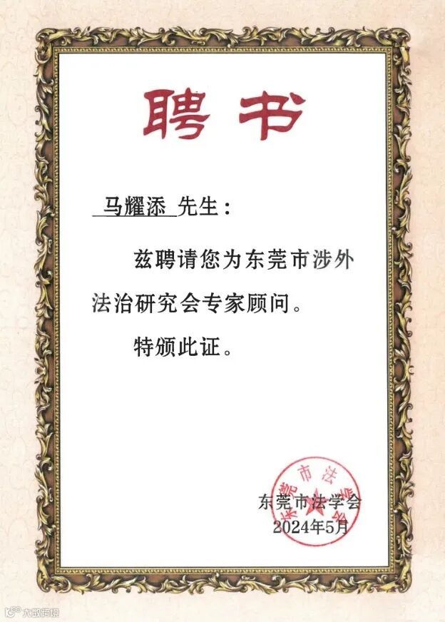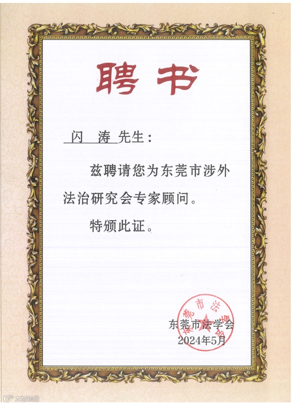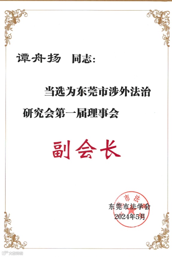 东莞分所谭舟杨律师当选东莞市涉外法治研究会第一届理事会副会长、陈巧玲律师当选为理事,粤港澳大湾区律师马耀添、何君尧和高级合伙人闪涛律师受聘为专家顾问。
