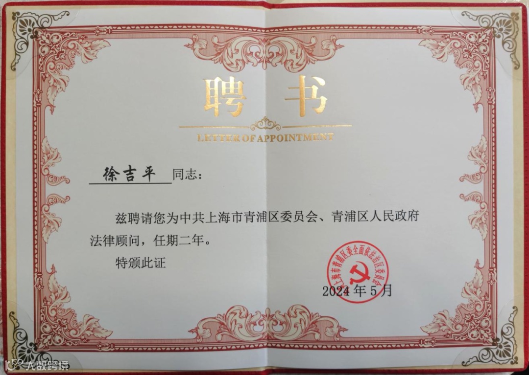 上海分所执行主任徐吉平律师再次获聘为中共上海市青浦区委员会、青浦区人民政府法律顾问。