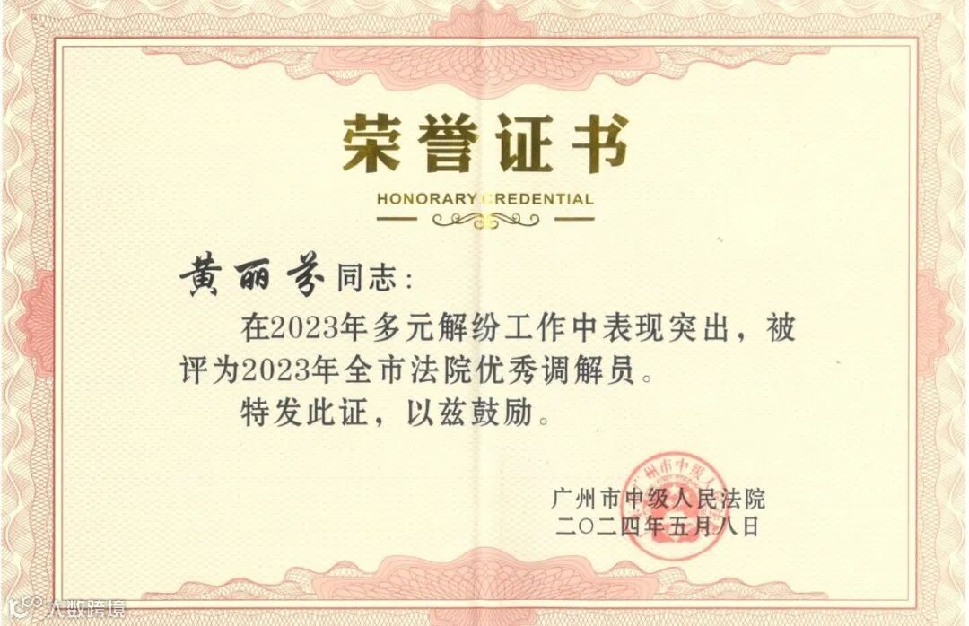 本所黄丽芬律师因在2023年多元解纷工作中表现突出,获广州市法院评为“2023年全市法院优秀调解员”。