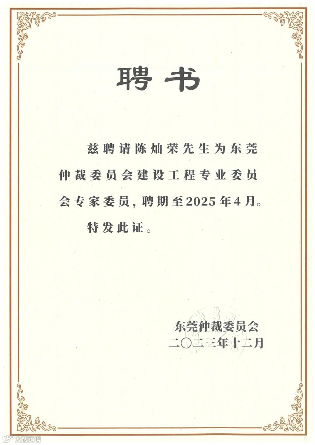 简讯 | 广信君达陈灿荣律师获聘为东莞仲裁委建设工程专业委员会专家委员