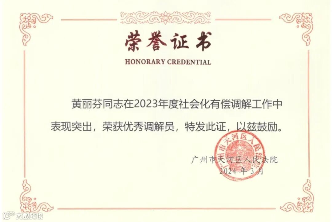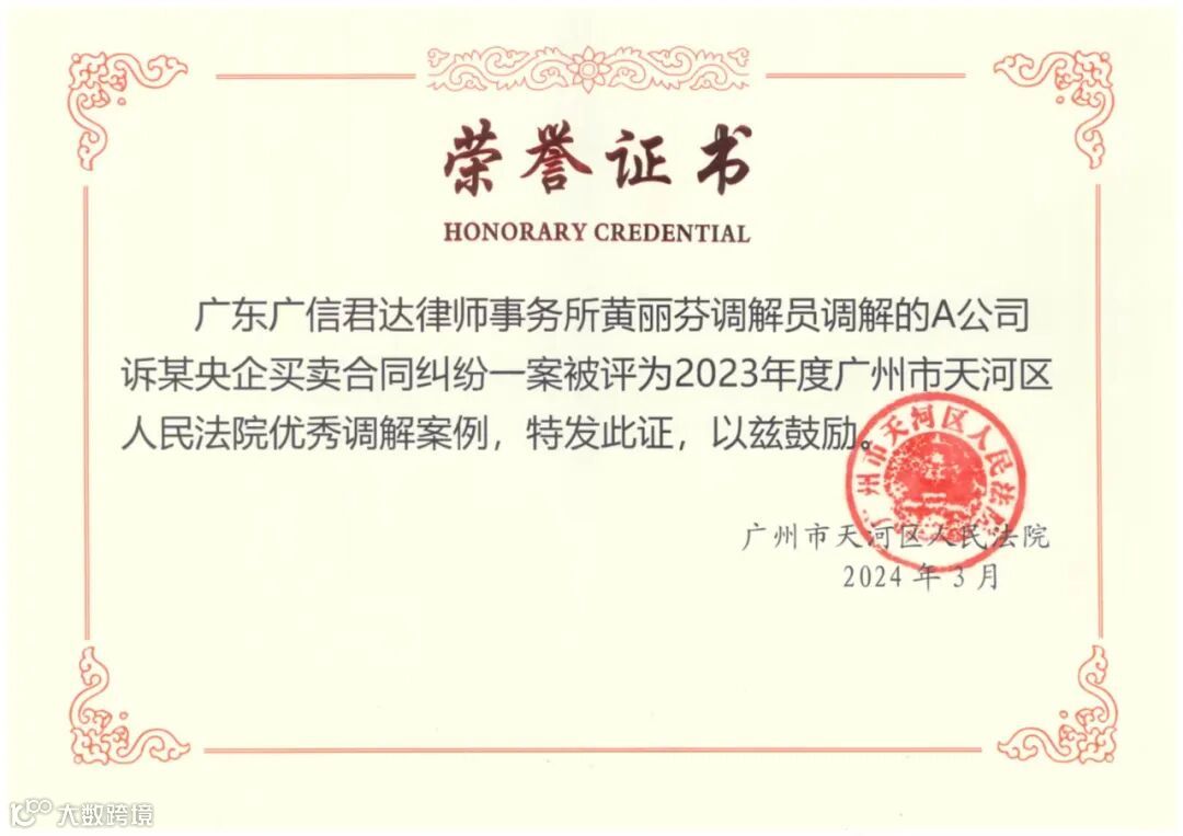 黄丽芬律师调解的“A公司诉某央企买卖合同纠纷案”,获评为2023年度广州市天河区人民法院优秀调解案例。
