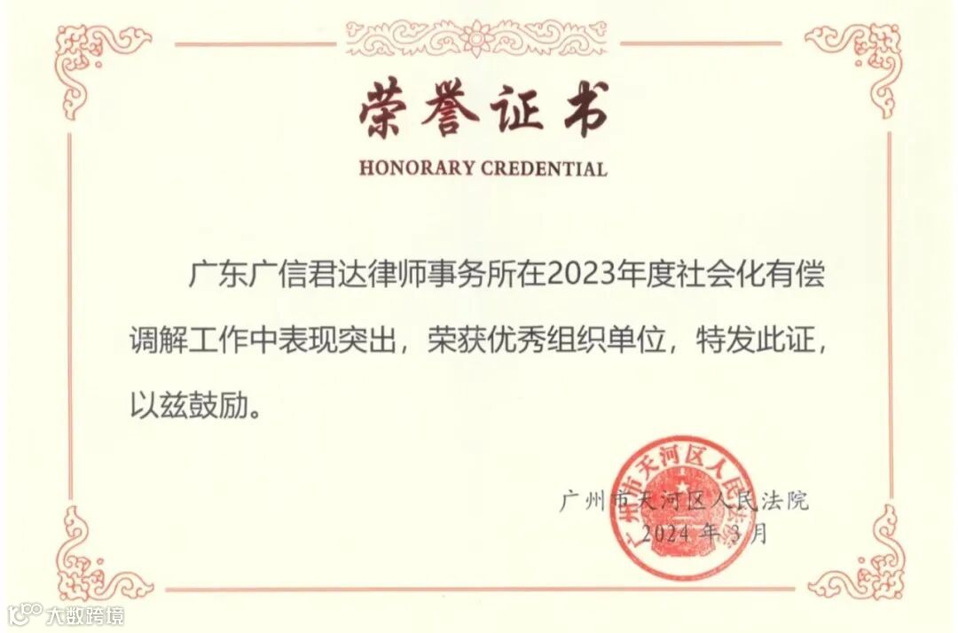 此次表彰,充分体现了天河法院对广信君达及律师实务能力的肯定和鼓励。广信君达及律师将继续在社会化有偿调解工作机制上探索深耕,认真履职尽责,发挥专业调解优势,不断提升工作质量,助力推动“市场纠纷市场解”,为更好优化法治化营商环境贡献力量。