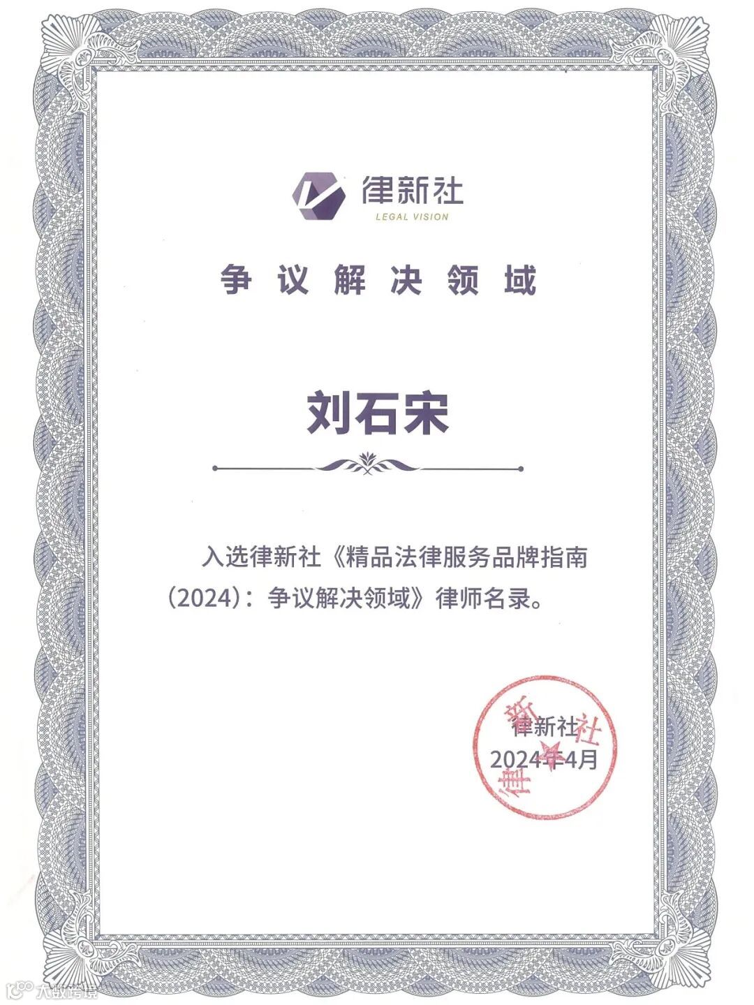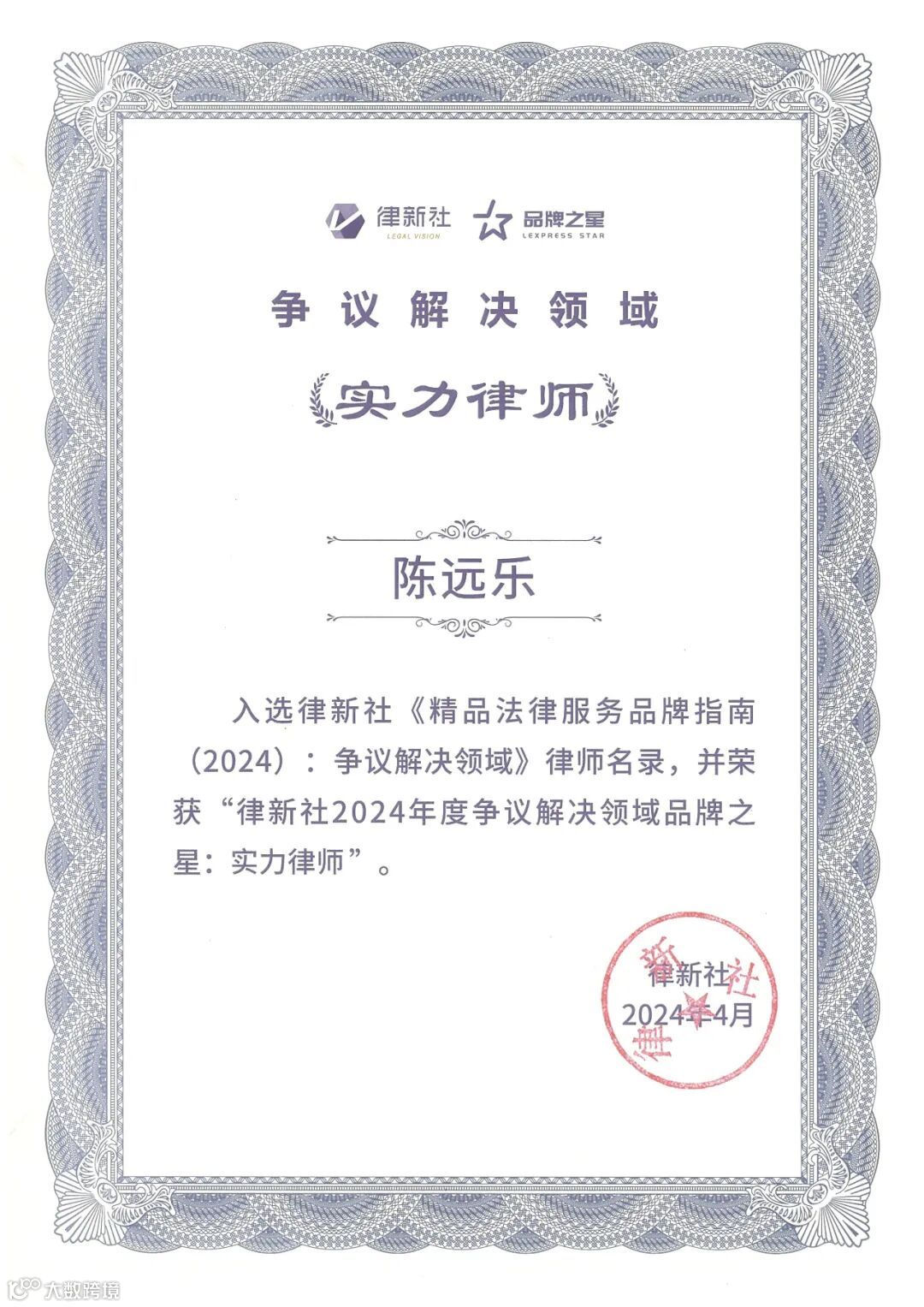 “2024年度争议解决领域品牌之星(实力律师)”,指经常参与技术难度极高的复杂案件,积极向行业输出重要案例和理论心得,受到客户和业界同行的广泛认可,且能够显著推动律所在该专业领域的发展。
