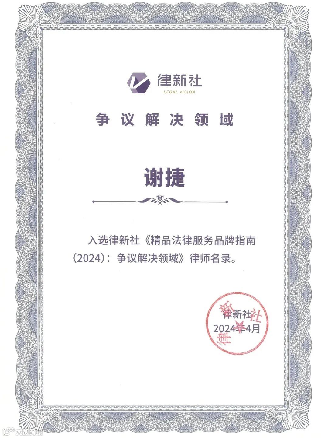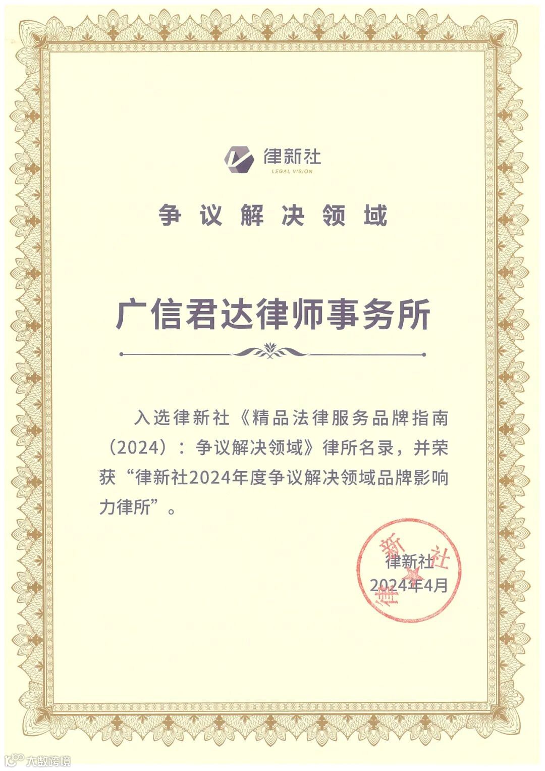 律新社“2024年度争议解决领域品牌影响力律所”,此奖项考察不仅包括常规的诉讼业务,还涵盖了仲裁、行政裁决、替代性争议解决机制(ADR)、世界贸易组织(WTO)争端解决以及各类复杂的涉外争端解决方案等争端领域提供卓越法律服务的品牌机构。