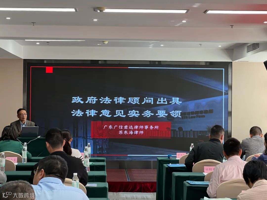 本所高级合伙人、合伙人会议联席主任苏东海律师作为省政府法律顾问受邀为省司法厅举办的肇庆、清远、云浮三市及其所辖县(市、区)政府法律顾问业务培训班作《政府法律顾问出具法律意见书实务要领》授课。苏东海律师结合政府法律顾问实务列举大量例子,讲授了政府法律顾问出具法律意见书的要点。课程受到了学员们的一致好评。