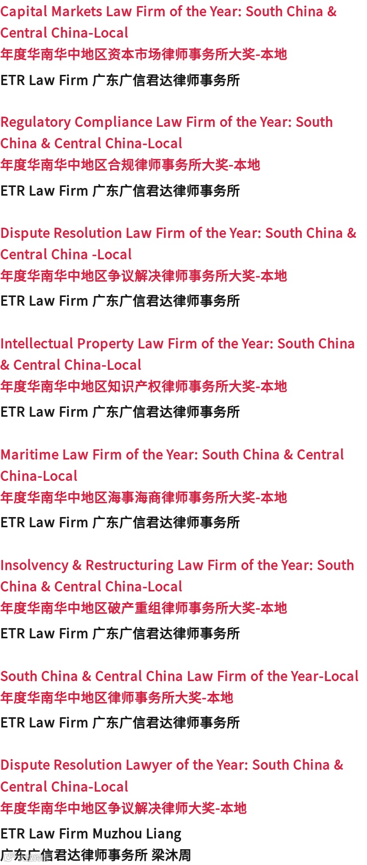 本所入围2023年ALB年度华南华中地区和华南华中地区资本市场、合规、知识产权、海事海商、争议解决、破产重组领域的(本地)律所大奖,合伙人梁沐周律师入围年度华南华中地区争议解决(本地)律师大奖。