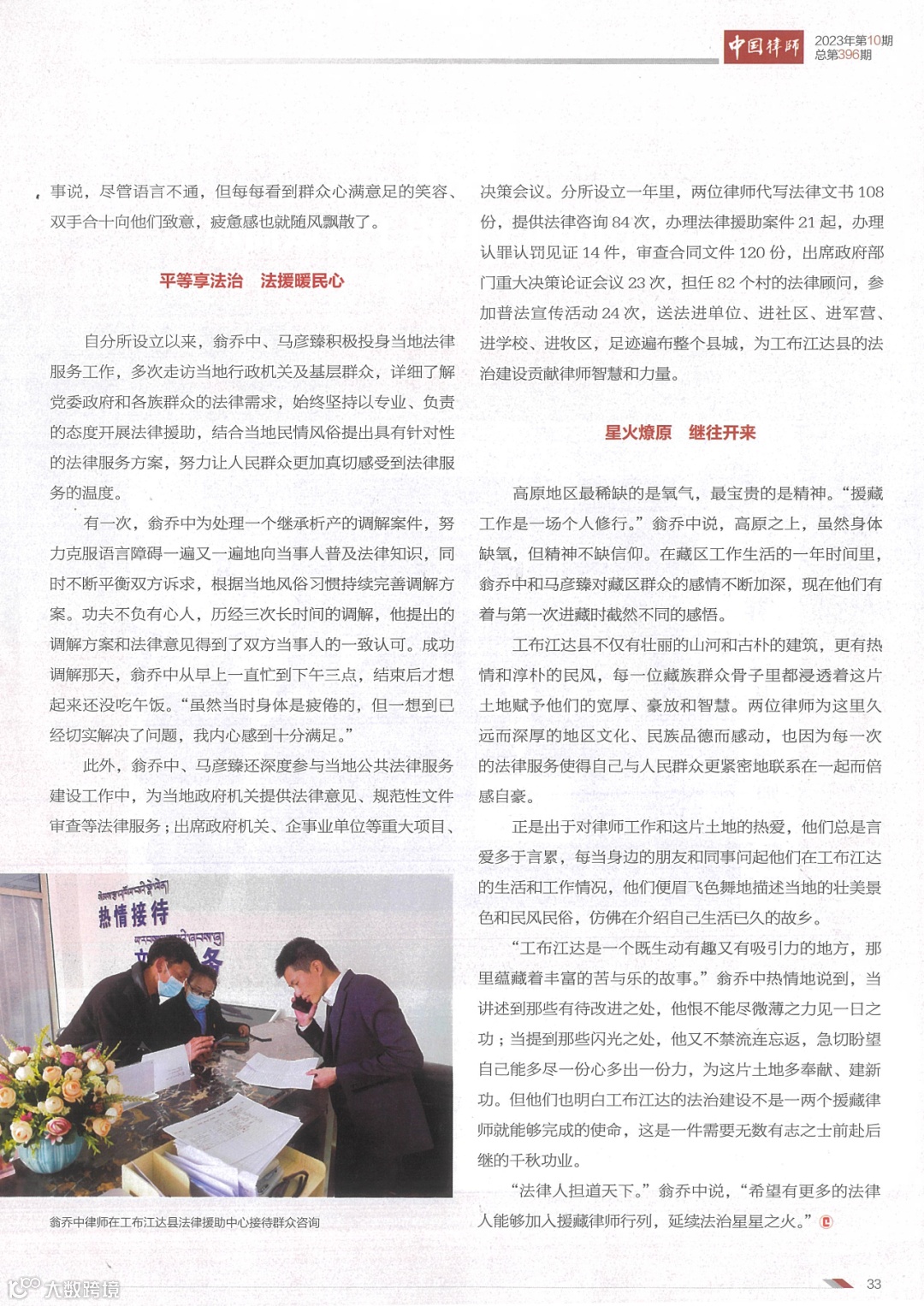 工布江达分所马彦臻、翁乔中律师在西藏开展法律服务受到律师行业的高度关注,获《中国律师》杂志宣传报道,事迹刊登于《中国律师》杂志2023年第10期。
