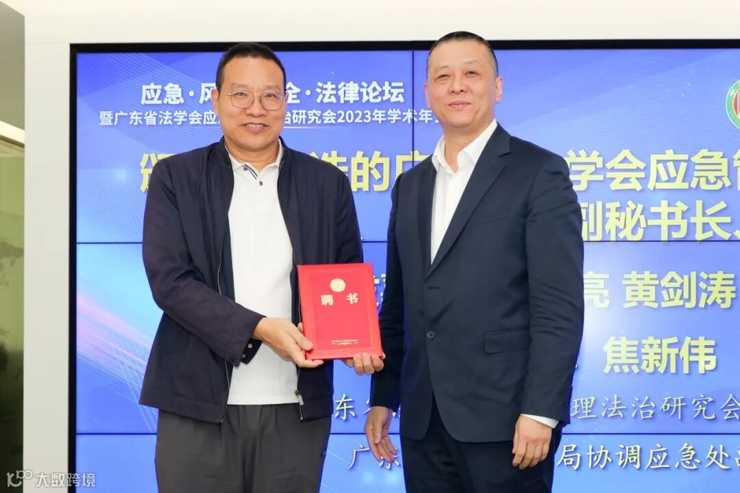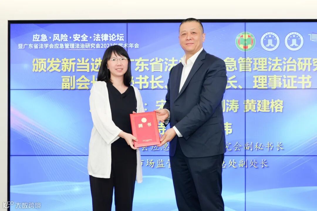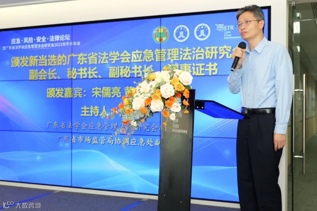 证书颁发仪式由广东省法学会应急管理法治研究会副秘书长、广东省市场监管局协调应急处副处长焦新伟主持,广东省法学会应急管理法治研究会会长、常务副会长宋儒亮、黄剑涛、黄建榕为新当选的法治研究会副会长、秘书长、副秘书长、理事证书颁发了证书。