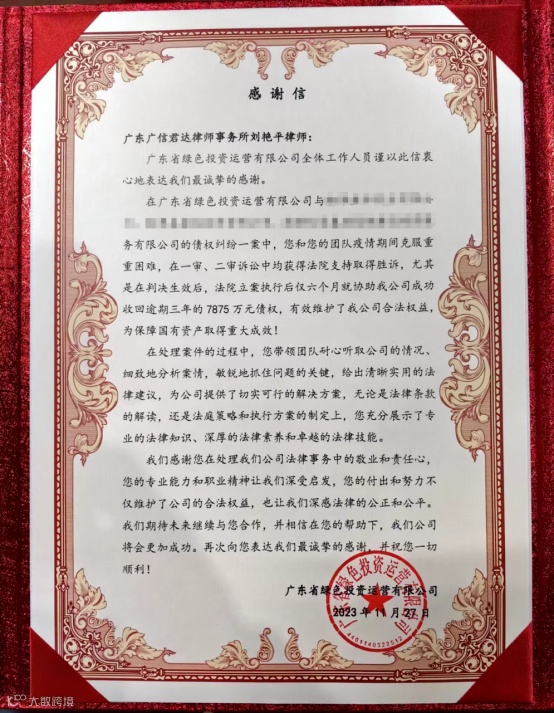 业绩 | 广信君达合伙人刘艳平律师团队助力广东省绿色投资运营有限公司收回逾期3年的7875万元债权