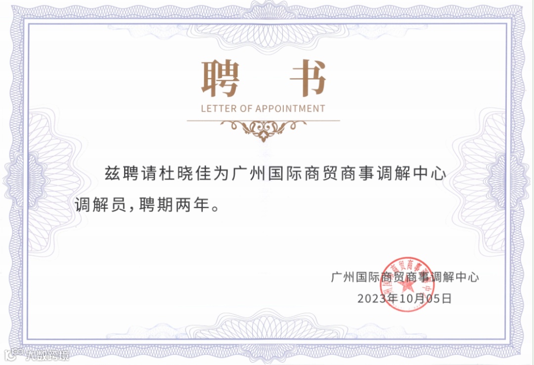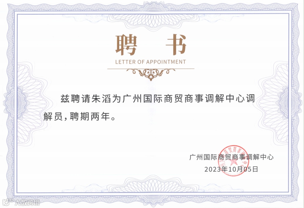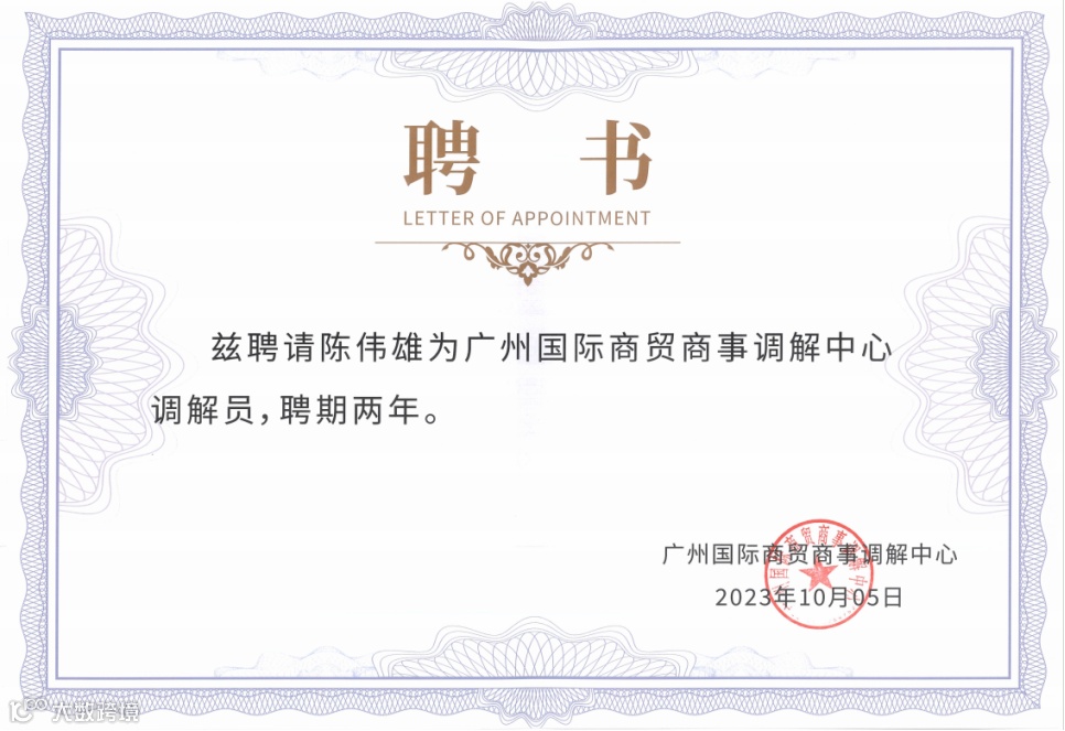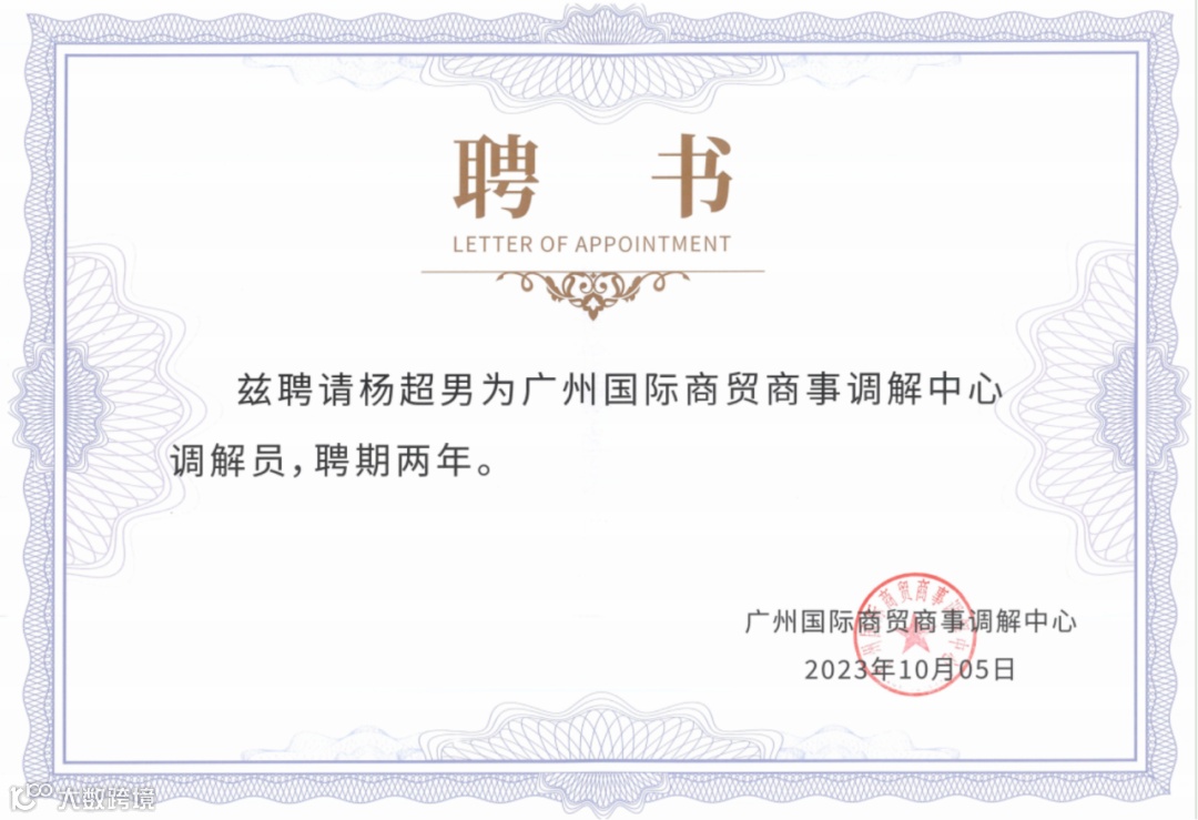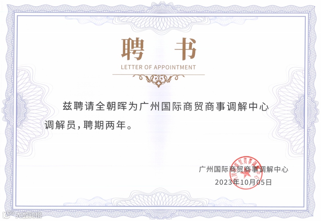 本所高级合伙人陈伟雄、全朝晖、杜晓佳律师,合伙人朱滔、林杰、杨超男律师受聘为广州国际商贸商事调解中心调解员。