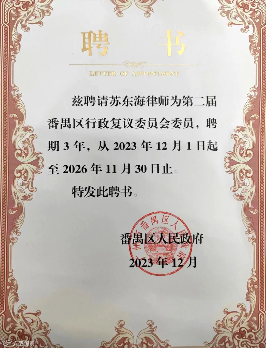 简讯 | 广信君达合伙人苏东海律师获聘为广州市番禺区第二届行政复议委员会委员