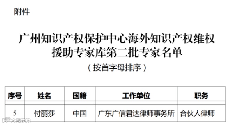 简讯 | 广信君达合伙人付丽莎律师入选广州知识产权保护中心海外知识产权维权援助专家库