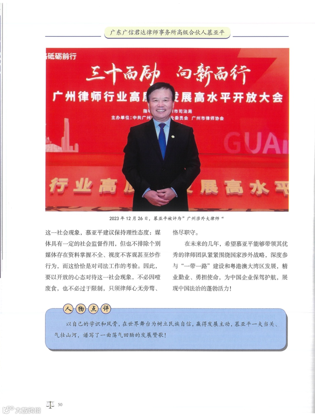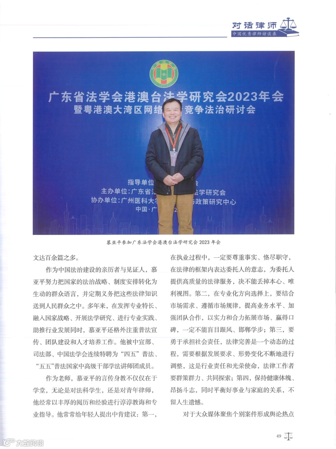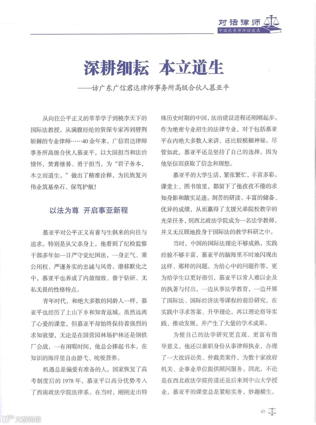 《对话律师——中国优秀律师访谈录》由中国商务出版社出版,向国内外公开发行,是一本集优秀律师执业历程访谈与经典案例相结合的访谈文集。2024年1月,广信君达律师事务所高级合伙人慕亚平律师接受专访,并被列为该文集的封面人物。