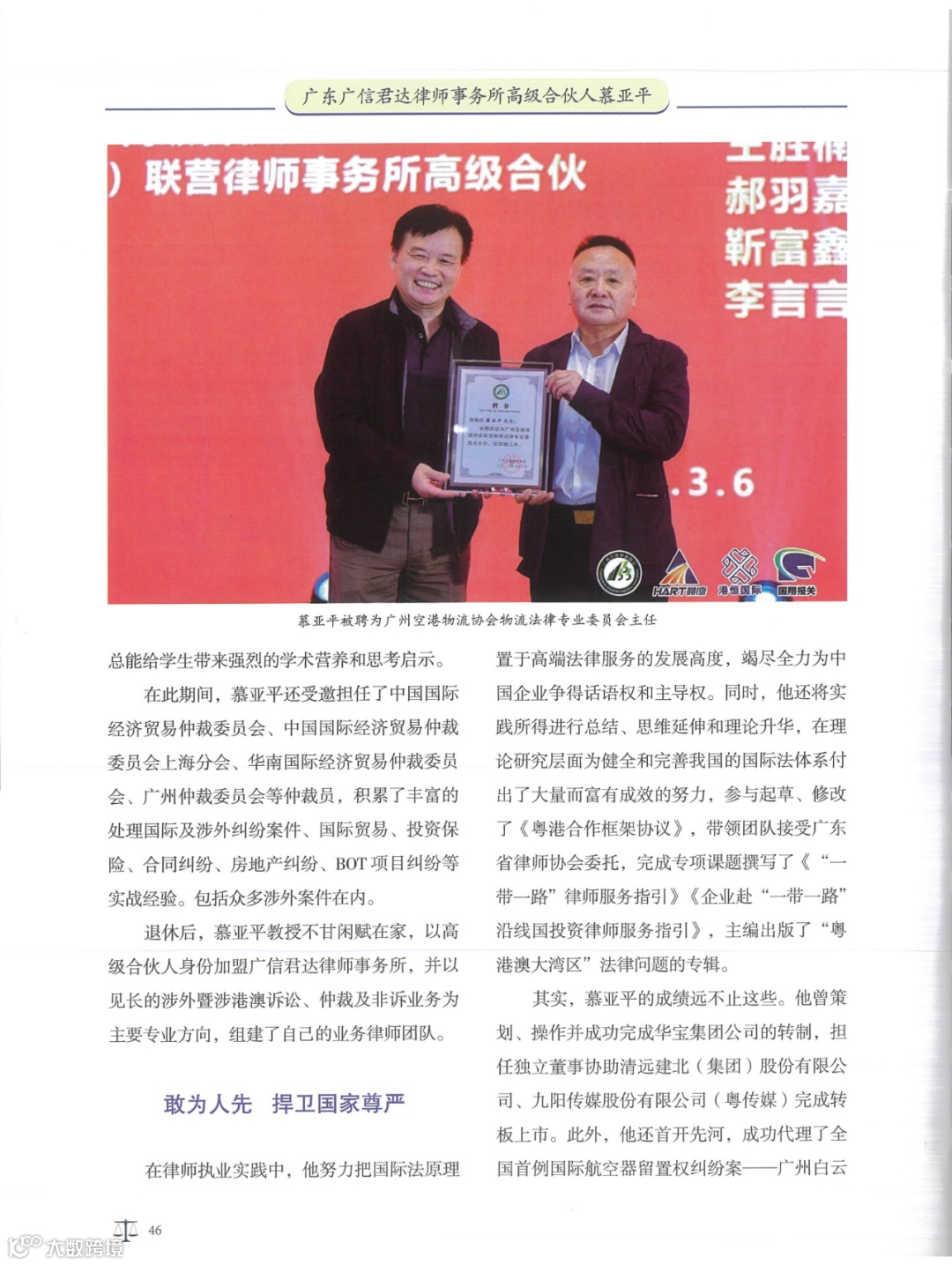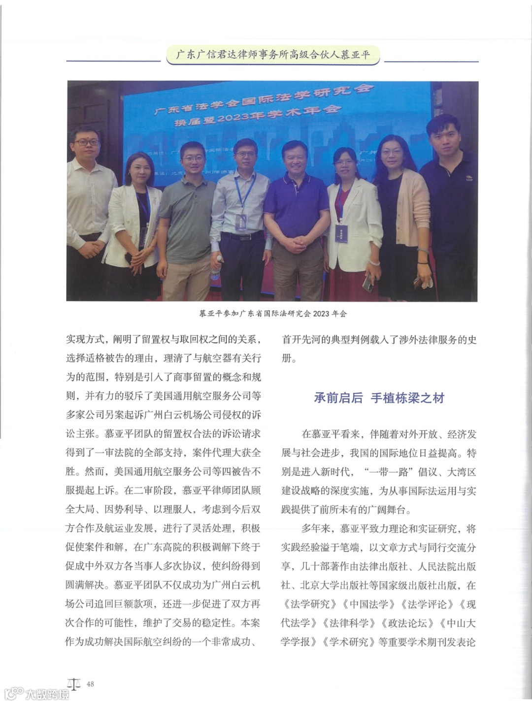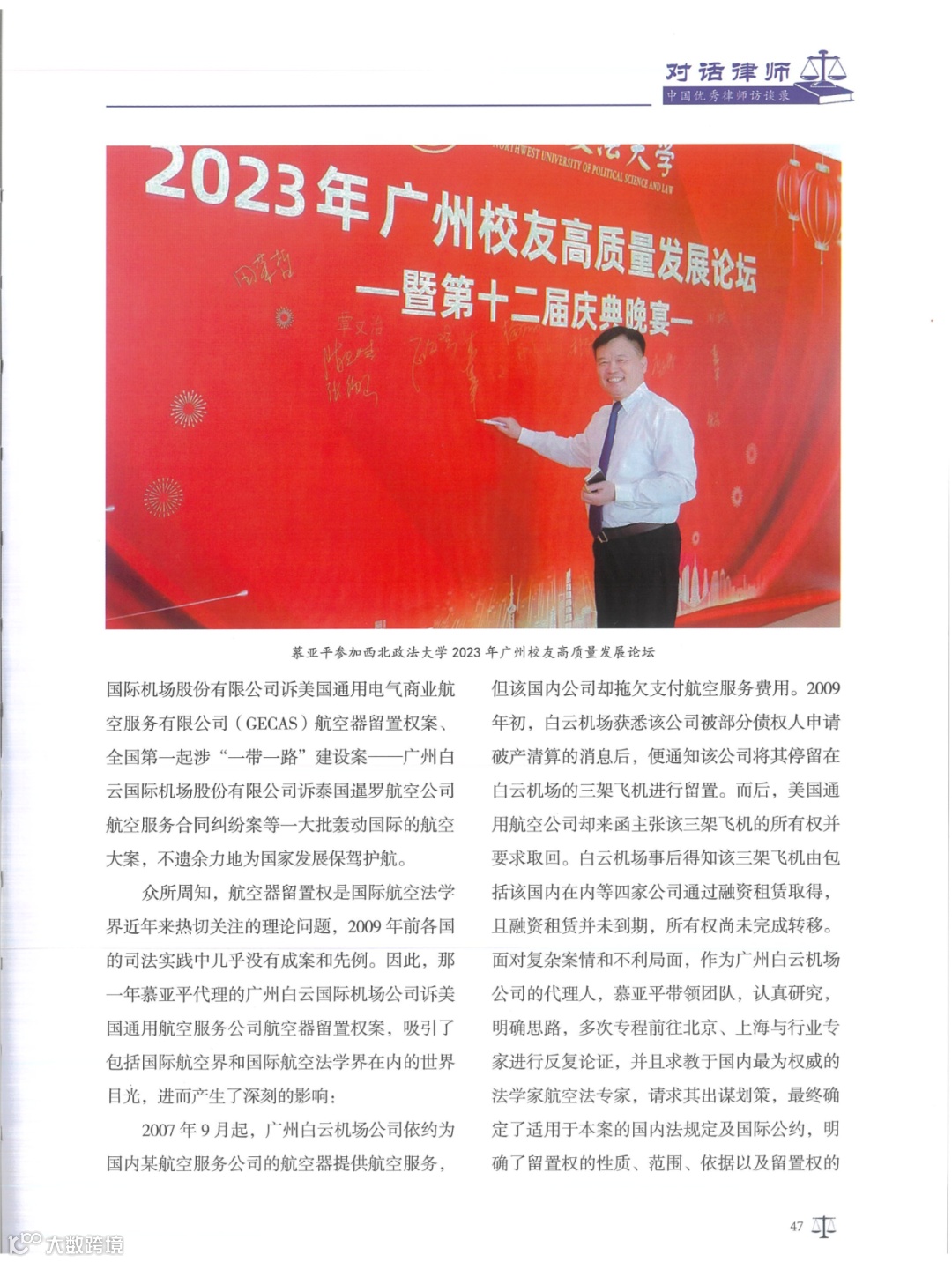 《对话律师——中国优秀律师访谈录》由中国商务出版社出版,向国内外公开发行,是一本集优秀律师执业历程访谈与经典案例相结合的访谈文集。2024年1月,广信君达律师事务所高级合伙人慕亚平律师接受专访,并被列为该文集的封面人物。