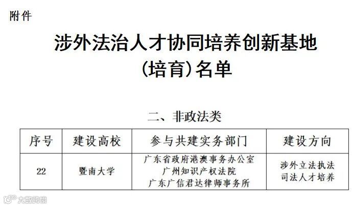 近日,教育部办公厅、中央依法治国办秘书局联合发布《关于公布涉外法治人才协同培养创新基地(培育)名单的通知》,暨南大学与中国政法大学、华东政法大学、中南财经政法大学等 11 所政法类高校,以及北京大学、中国人民大学、清华大学等40所非政法类高校共同获批教育部“涉外法治人才协同培养创新基地(培育)”,是广东省内仅有的三所获批高校之一。广信君达律师事务所作为参与共建实务部门,将联合广东省政府港澳事务办公室、广州知识产权法院等,与暨南大学共同建设“涉外立法执法司法人才培养”项目,建立协同培养机制。