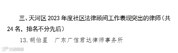 本所胡伯星律师被评为“2023年度社区法律顾问工作表现突出的律师”。