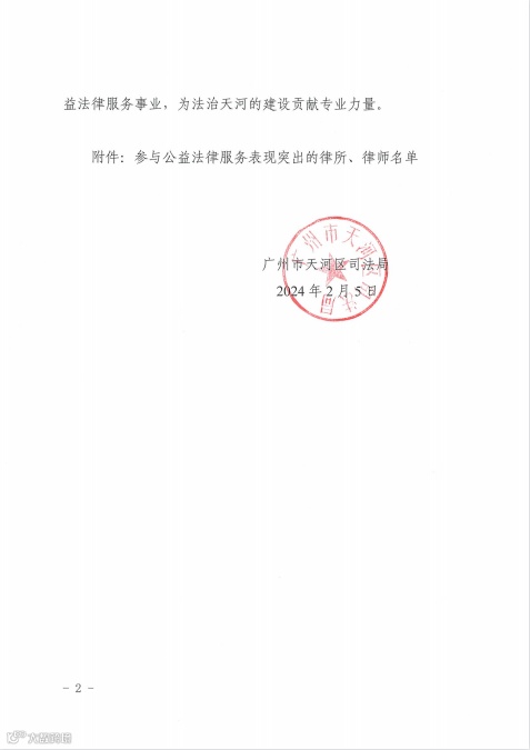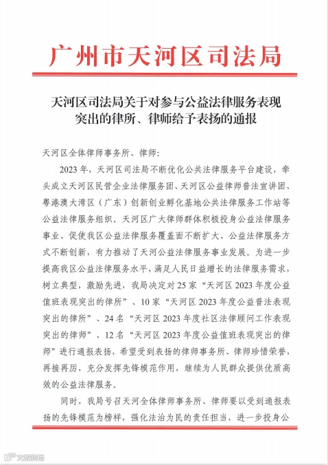为进一步提高公益法律服务水平,满足人民日益增长的法律服务需求,树立典型,激励先进,2024年2月5日,天河区司法局对参与公益法律服务表现突出的律所、律师给予表扬通报。
