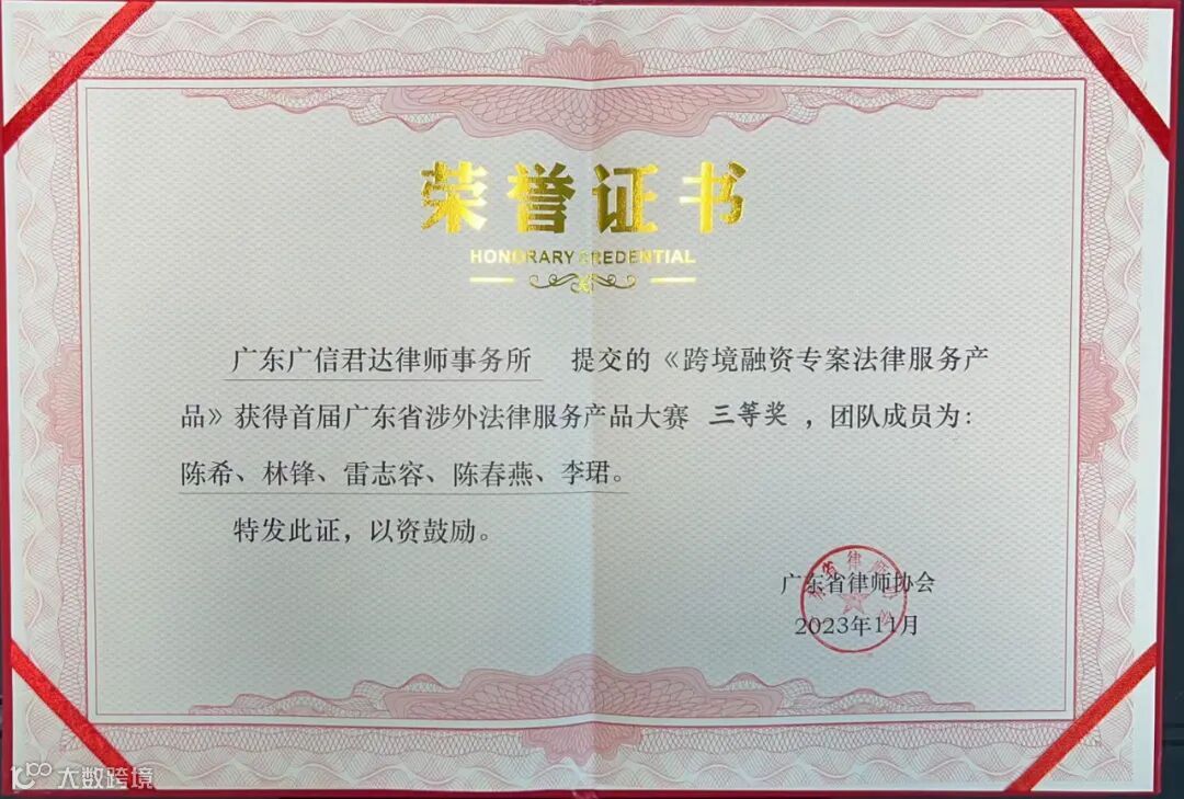 专业引领,匠心铸造。本次获奖充分体现了广信君达律师团队丰富的知识储备与卓越的研发能力。广信君达将珍惜荣誉、总结成果,进一步深化打磨更多优质的法律服务产品,推动提高本所律师的专业水平和法律素养,提升涉外法律服务能力,为广东省律师行业高质量发展贡献力量。
