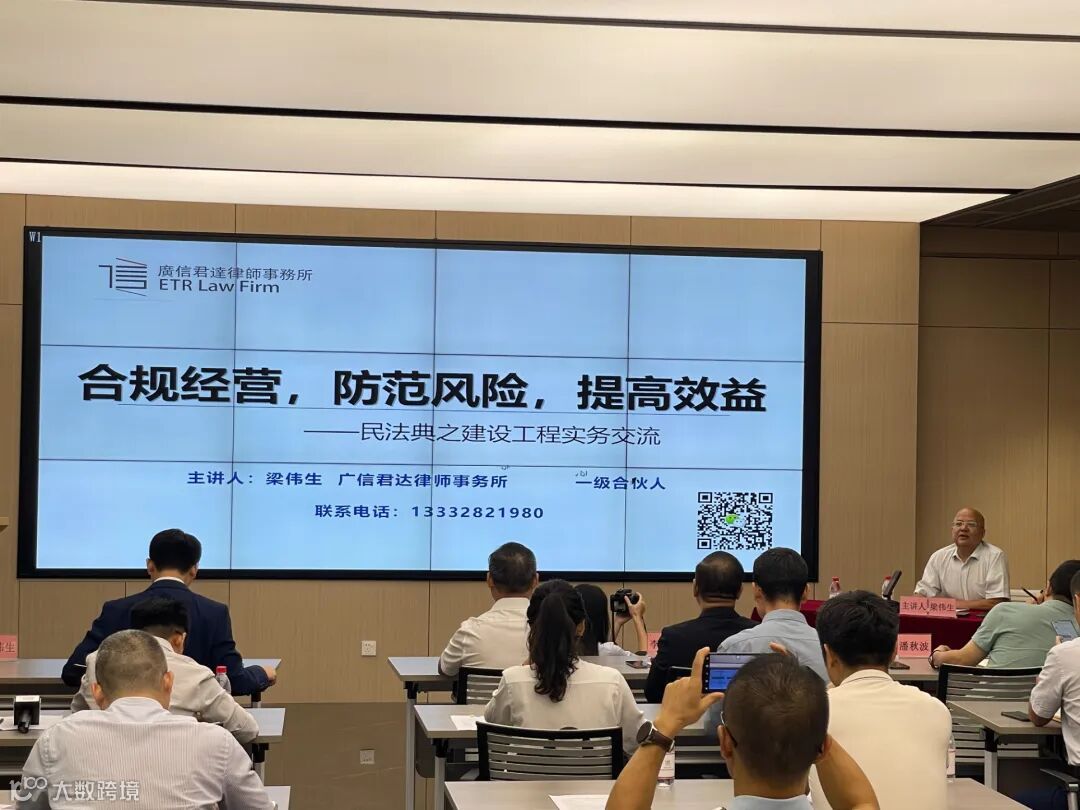 2023年9月22日下午,由广东省律师协会、东莞市律师协会民事法律专业委员会主办的“促进高质量发展——民法典培训会”在广信君达(东莞)律师事务所成功举办,逾60名律师同行现场参加培训,超2300人次参加线上直播学习。广信君达律师事务所合伙人梁伟生律师受邀参加,并作建设工程实务主题分享,其团队林育维、何嘉怡律师及实习律师徐淑怡一同前往参加培训。