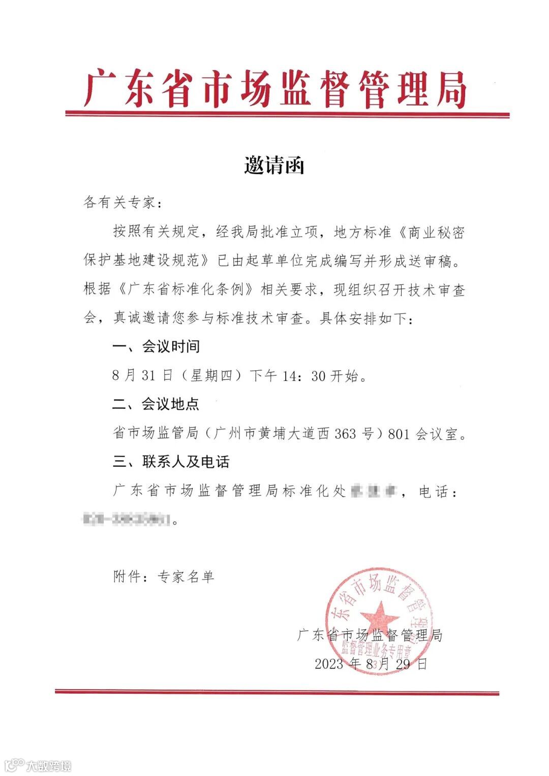 2023年8月31日下午,广东省市场监督管理局根据《广东省标准化条例》要求,组织召开技术审查会,对《商业秘密保护基地建设规范》(简称“《规范》”)送审稿进行标准技术审查,邀请行业专家学者、知识产权领域律师代表等进行专家会谈。其中,广东省律师协会城市更新委员会委员、广信君达律师事务所高级合伙人林杨律师受邀担任技术审查会专家,就《规范》送审稿内容提出专业建议。