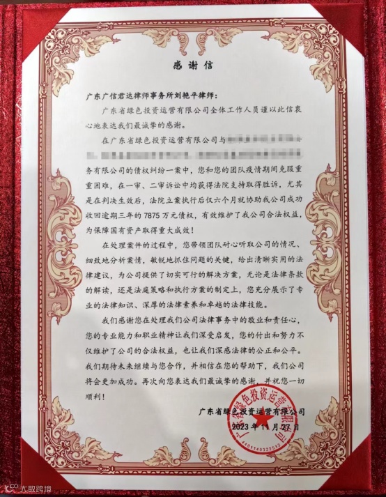 近日,广东省绿色投资运营有限公司向广信君达律师事务所高级合伙人刘艳平律师团队发来感谢信并赠送锦旗,对其在一宗债权纠纷案件中提供的专业法律服务表示衷心感谢。该案件涉及3家被告,共计7875万元的债权。作为广信君达的高级合伙人,刘艳平律师带领团队克服重重困难,在一审、二审诉讼中均获得法院支持,取得胜诉。