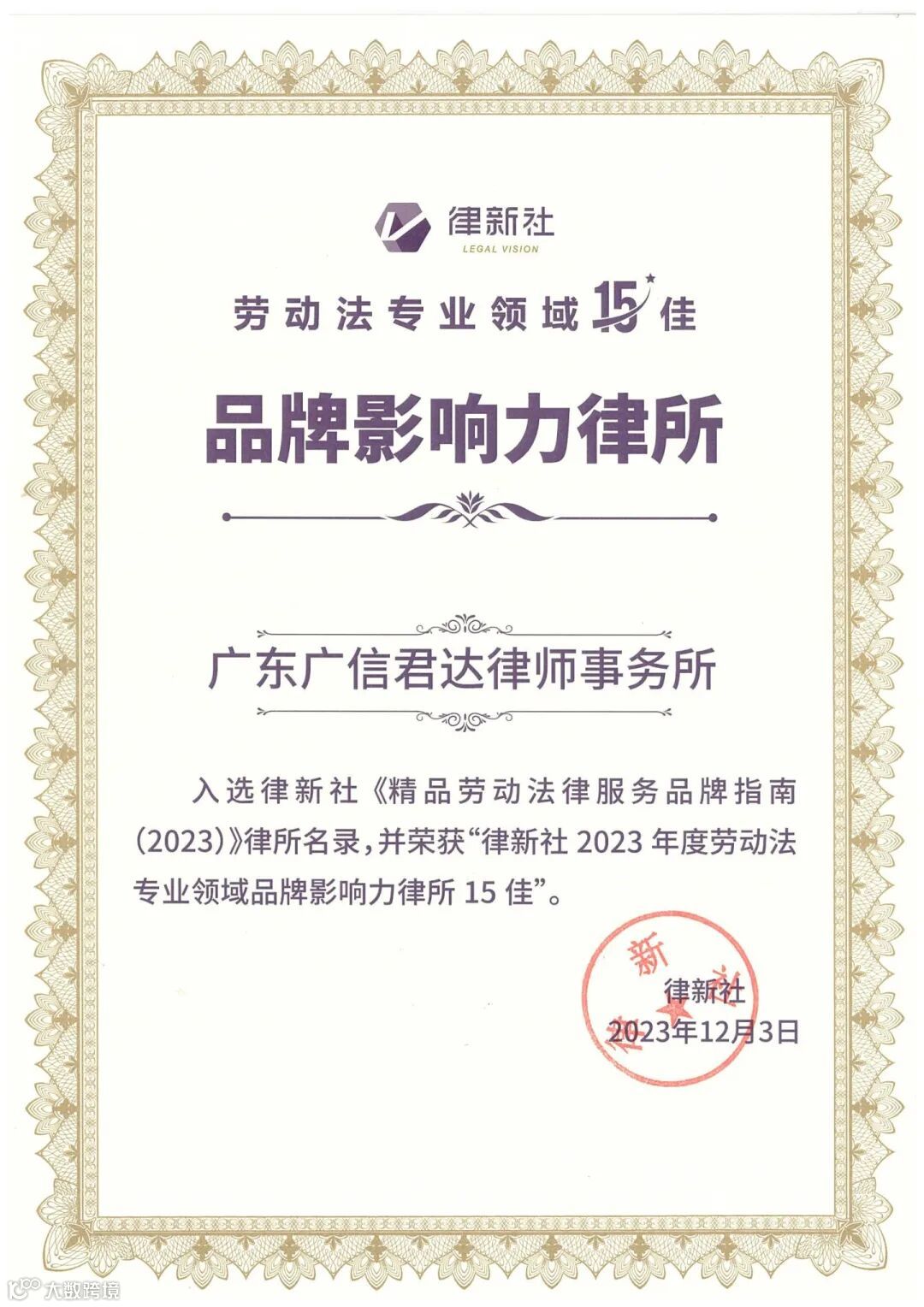 广信君达获评“2023年度劳动法专业领域品牌影响力律所15佳”
