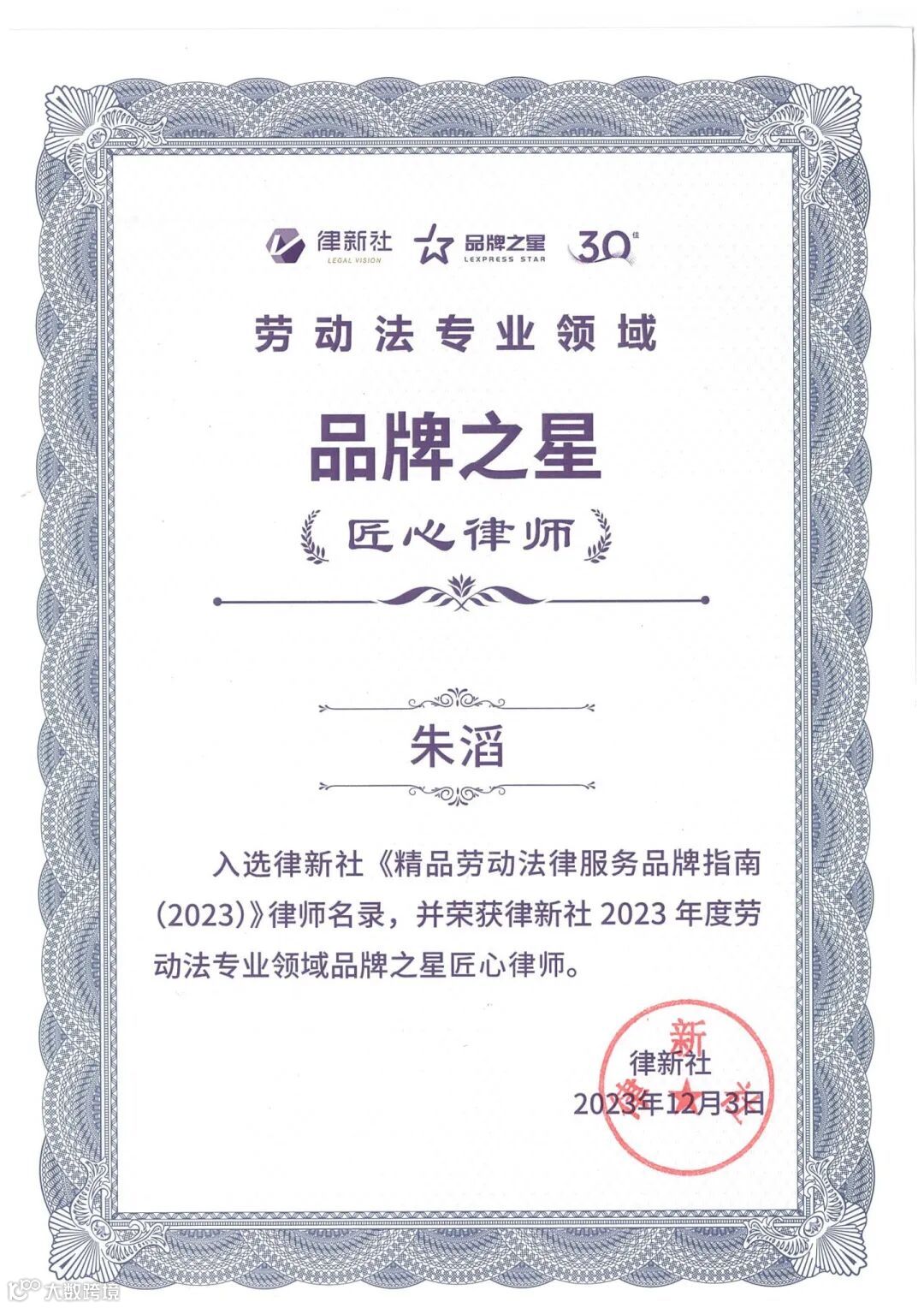 朱滔律师获评“2023年度劳动法专业领域品牌之星30佳(匠心律师)”