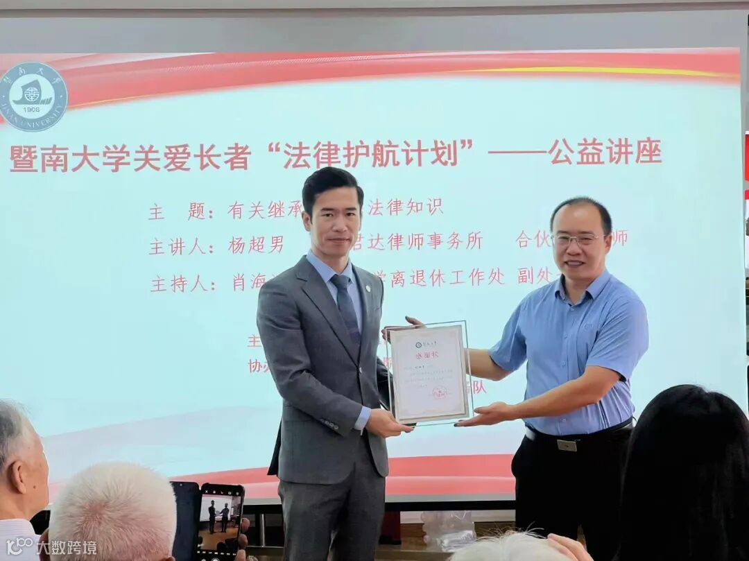 为切实增强老年人法律意识,着力维护老年人的合法权益,2023年11月9日,广信君达律师事务所合伙人杨超男律师受暨南大学离退休工作处邀请,为暨南大学关爱长者“法律护航计划”开展题为“有关继承的重要法律知识”公益讲座,贺诗语律师助理协助。暨南大学离退休工作处副处长肖海滨、办公室刘婷婷老师出席本次活动,来自暨南大学的离退休教职工90余人参加。