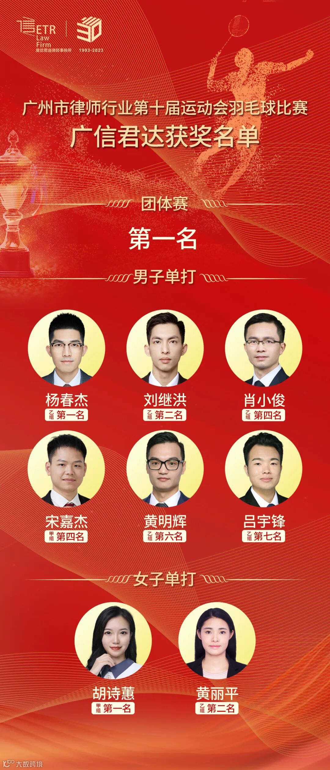 势不可挡。广信君达羽毛球队将良好状态持续到比赛的次日,参赛队员全员晋级,并获得优异成绩。特别是,在乙组男子单打冠亚军决赛中,我所杨春杰与刘继洪律师上演巅峰对决,最终杨春杰以微弱优势胜出,卫冕该组别单打冠军。巾帼不让须眉,在甲组女单决赛中,胡诗蕙律师出色发挥,以娴熟的技巧和超常的心态,战胜对手;乙组女单决赛上,黄丽平律师面对劲敌,展现出了顽强毅力和不屈斗志,不断将比分追平,进入加时赛,最终惜败,获得第二名。