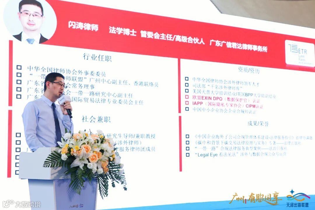 为贯彻落实省、市、区高质量发展的工作部署,充分发挥广州市天河区国家文化出口基地的示范带动作用,积极推动服务贸易高质量发展,2023年11月9日,“万物潮新 聚势而生”2023天河出海联盟成立仪式暨“广州有服同享”出海政策分享会在天河举办。广信君达律师事务所受聘为“天河出海联盟成员单位”,本所高级合伙人闪涛律师受邀出席,并开展“跨境数据合规法律风险与防范”主题演讲。