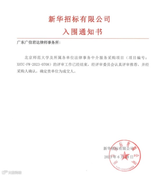 近日,中国政府采购网公布北京师范大学及所属各单位法律事务中介服务采购项目入围名单,其中,广信君达律师事务所以出色的资质实力、完善的法律服务和丰富的实践经验入选。