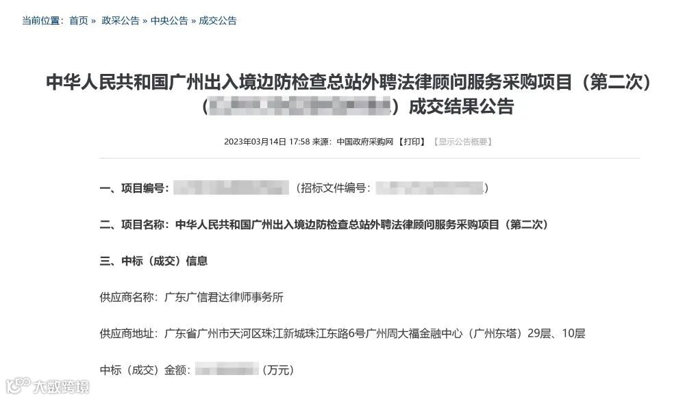 近日,广信君达律师事务所凭借专业水平与优质法律服务,以综合评分第一的优势成功中标中华人民共和国广州出入境边防检查总站(简称“广州边检总站”)外聘法律顾问服务采购项目,该项目由本所合伙人谢海傲牵头,与高级合伙人章勋、慕亚平,合伙人方晖,专职律师毛英、施宝怡、高婷婷组成该项目法律服务团队。