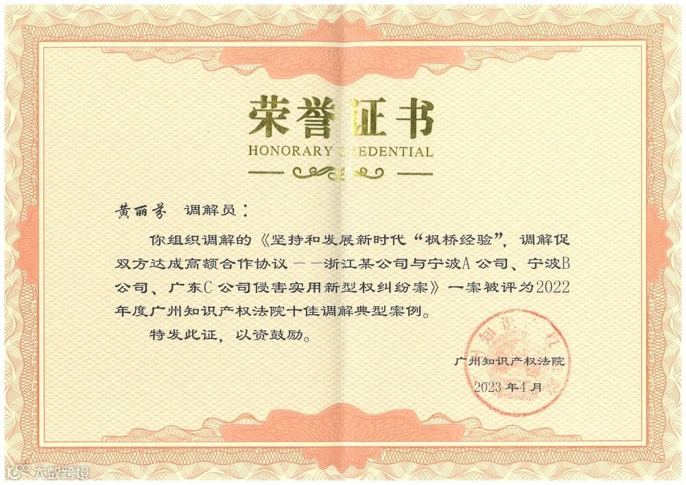 近日,广州知识产权法院召开2022年度巡回审判法庭及特邀调解组织工作座谈会,并表彰通报2022年度“优秀调解组织”“优秀调解员”,发布“诉前调解十佳典型案例”。其中,广信君达律师事务所黄丽芬律师调解的“浙江某公司与宁波A公司、宁波B公司、广东C公司侵权实用新型专利权纠纷”案成功入选广州知识产权法院2022年度“诉前调解十佳典型案例”,并受到人民法院报、人民网、南方新闻网、广东省高级人民法院、广州知识产权法院等多家官方宣传。