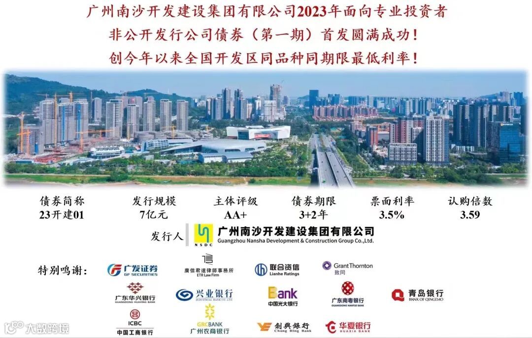 2023年4月,在各方的大力支持下,广州南沙开发建设集团有限公司(简称“广州南沙开建集团”)2023年面向专业投资者非公开发行公司债券 (第一期) (简称“项目”)首发圆满成功,发行规模为7亿元,创2023年以来全国开发区同品种同期限最低利率!
