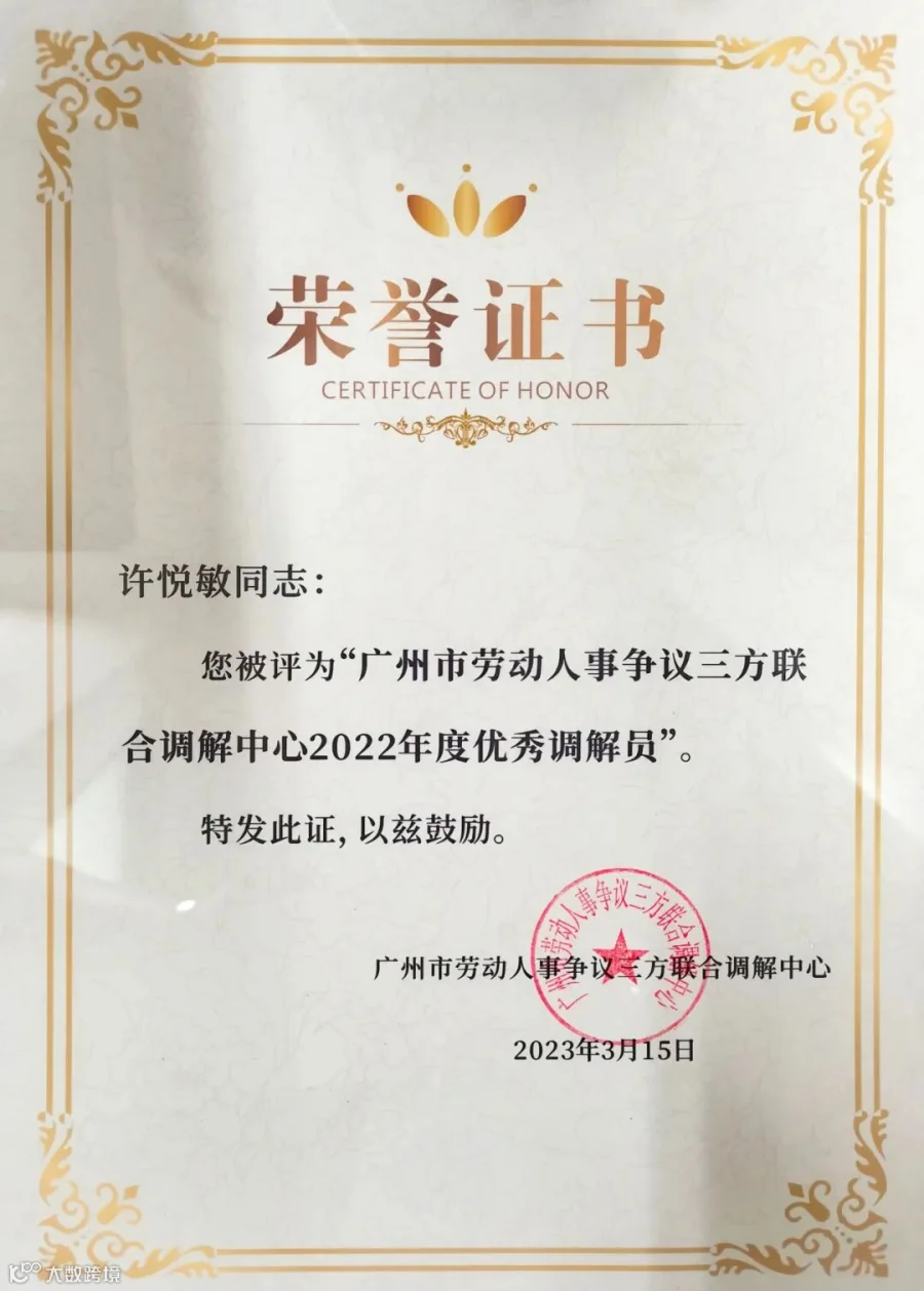 此次获评是广州市劳动人事争议三方联合调解中心对广信君达律师专业水平、调解能力和法律素养的高度认可。广州市劳动人事争议三方联合调解中心成立于2017年,2020年起本所许悦敏律师、郭文萃律师接受广州市总工会的指派参与该中心的劳动争议调解工作。未来广信君达律师将继续充分发挥专业优势,践行“人民律师为人民”理念,为法治中国建设、维护和谐劳动关系、构建国际一流营商环境贡献广信君达力量。