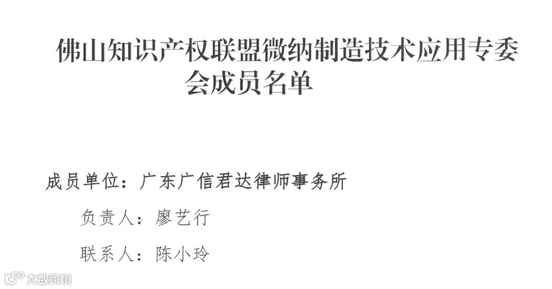 2023年3月9日,由佛山市市场监督管理局(知识产权局)主办的佛山知识产权转移转化联盟(简称“佛山知产转化联盟”)成立大会成功举办。该联盟旨在搭建知识产权成果供需对接桥梁纽带,推动知识产权转移转化,赋能佛山制造业高质量发展,广信君达律师事务所受邀参加,并入选该联盟微纳制造技术应用专委会成员,本所投融资专业部秘书长廖艺行律师代表出席。