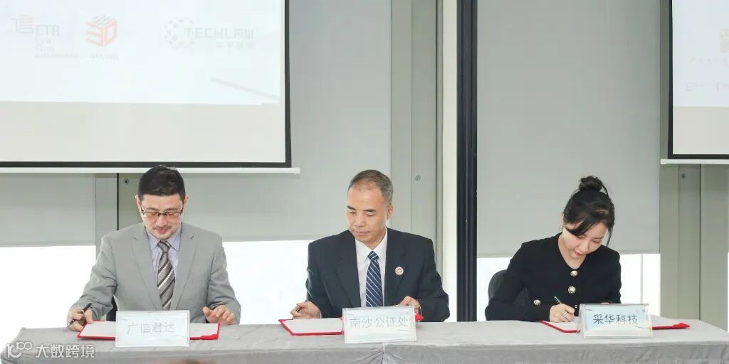 广州市南沙公证处、广信君达、采华科技三方共同举行线上赋强公证业务战略合作协议签约仪式。