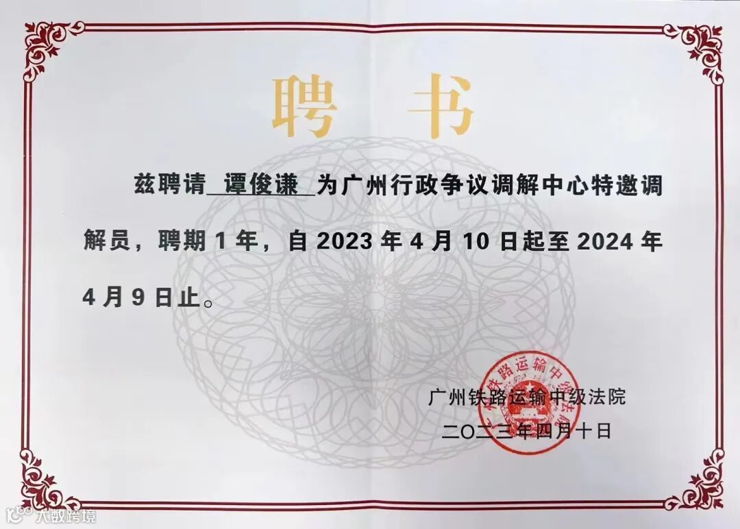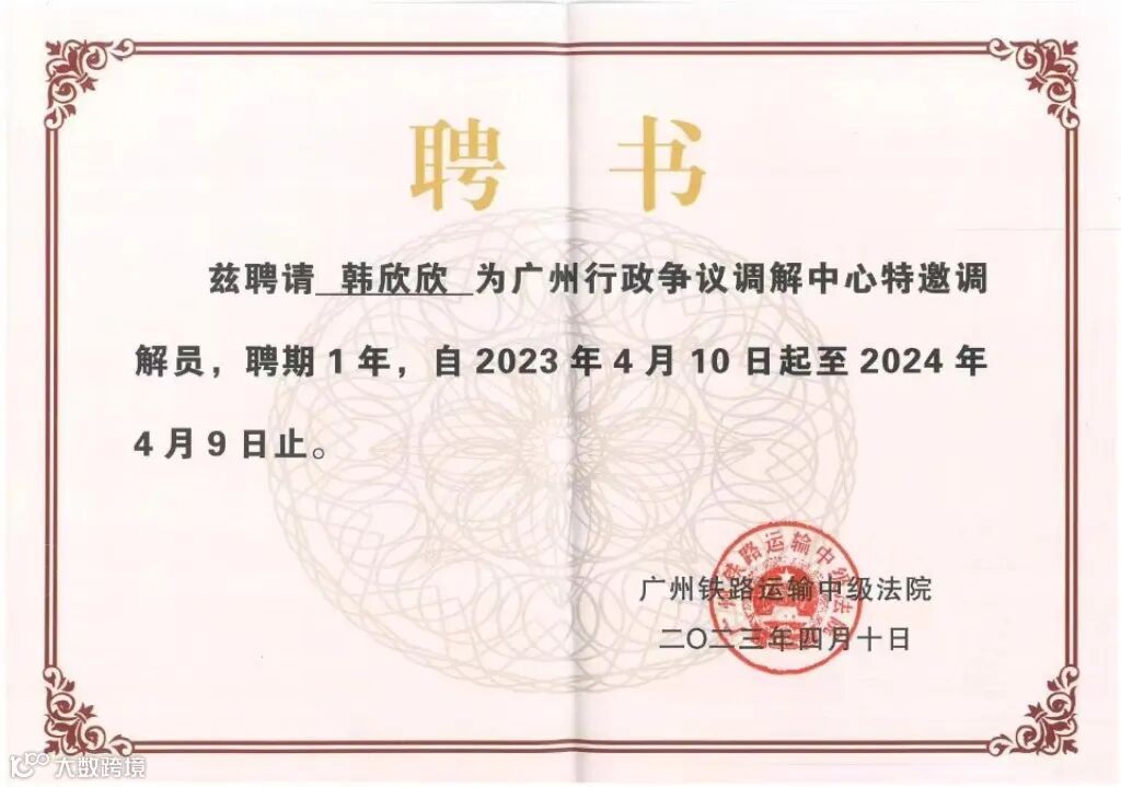 2023年4月10日上午,广州行政争议调解中心特邀调解员和特邀调解组织聘任仪式暨业务培训会在广东法官学院隆重举行。其中,广信君达律师事务所韩欣欣、谭俊谦律师被聘任为特邀调解员,聘期1年。