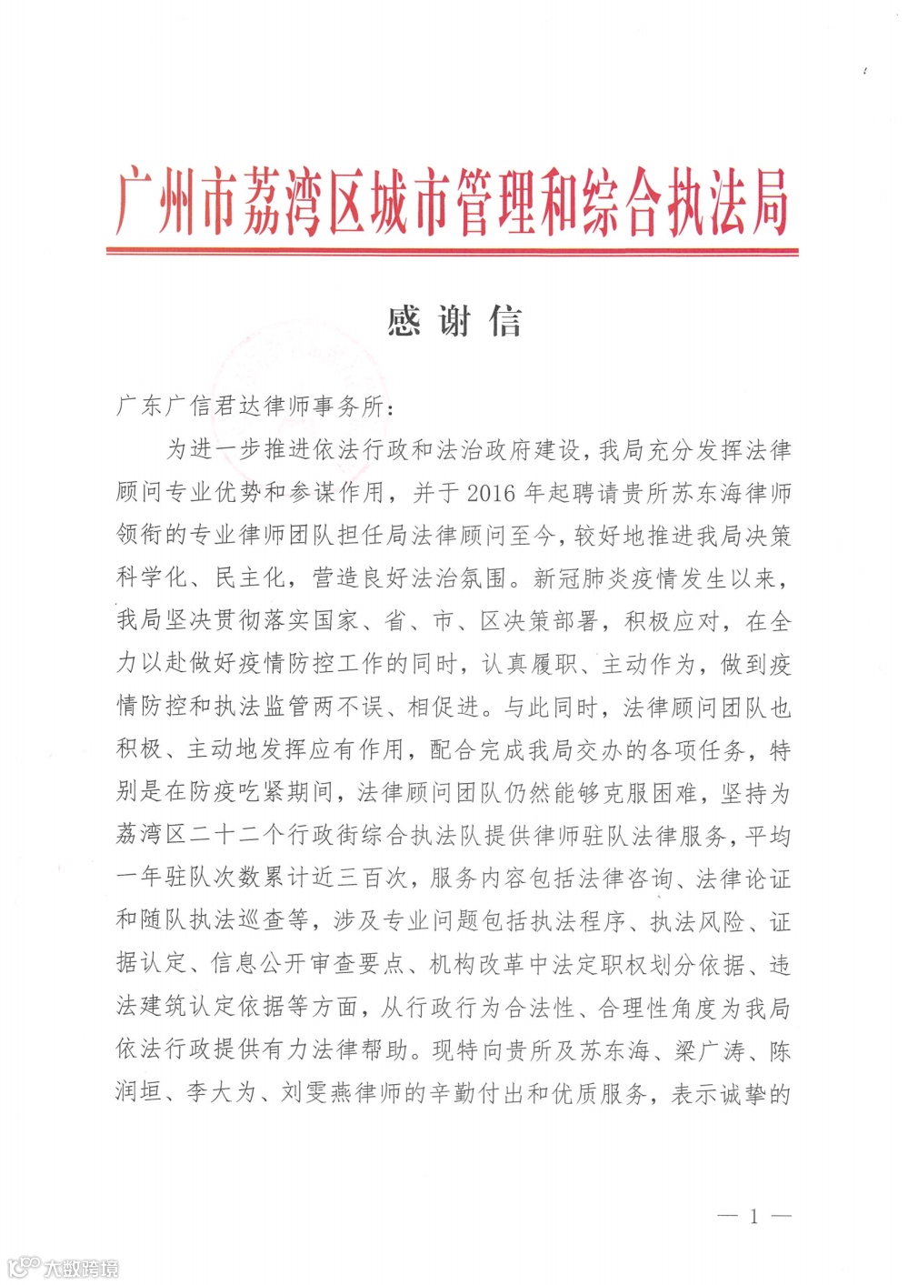 简讯 | 广信君达及苏东海律师团队获广州市荔湾区城市管理和综合执法局感谢信