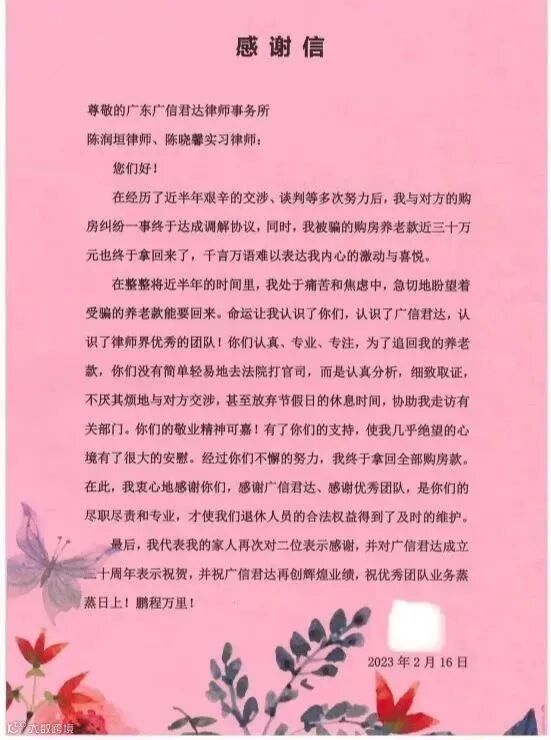 本所高级合伙人苏东海律师团队的陈润垣律师、陈晓馨实习律师收到来自客户叶女士(化姓)的感谢信及锦旗。