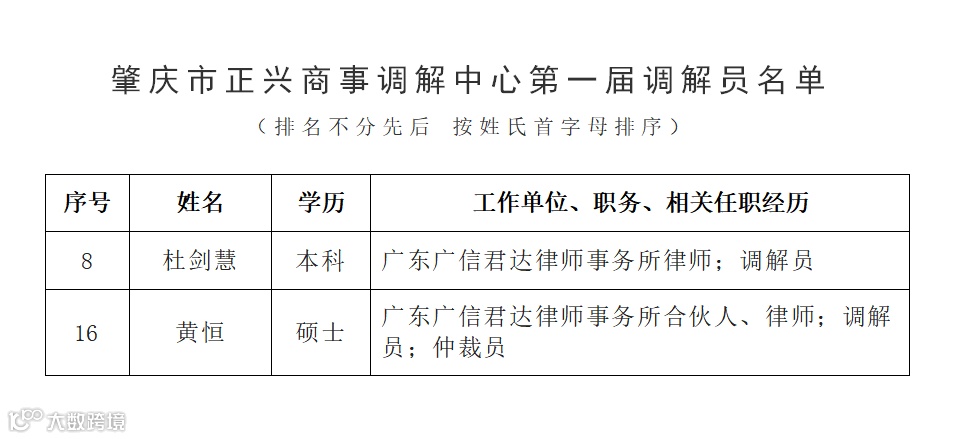 近日,经推荐/自荐报名、资格审查、会议研究、名单公示等程序,广信君达律师事务所合伙人黄恒律师、杜剑慧律师受聘为肇庆市正兴商事调解中心调解员,聘期4年。