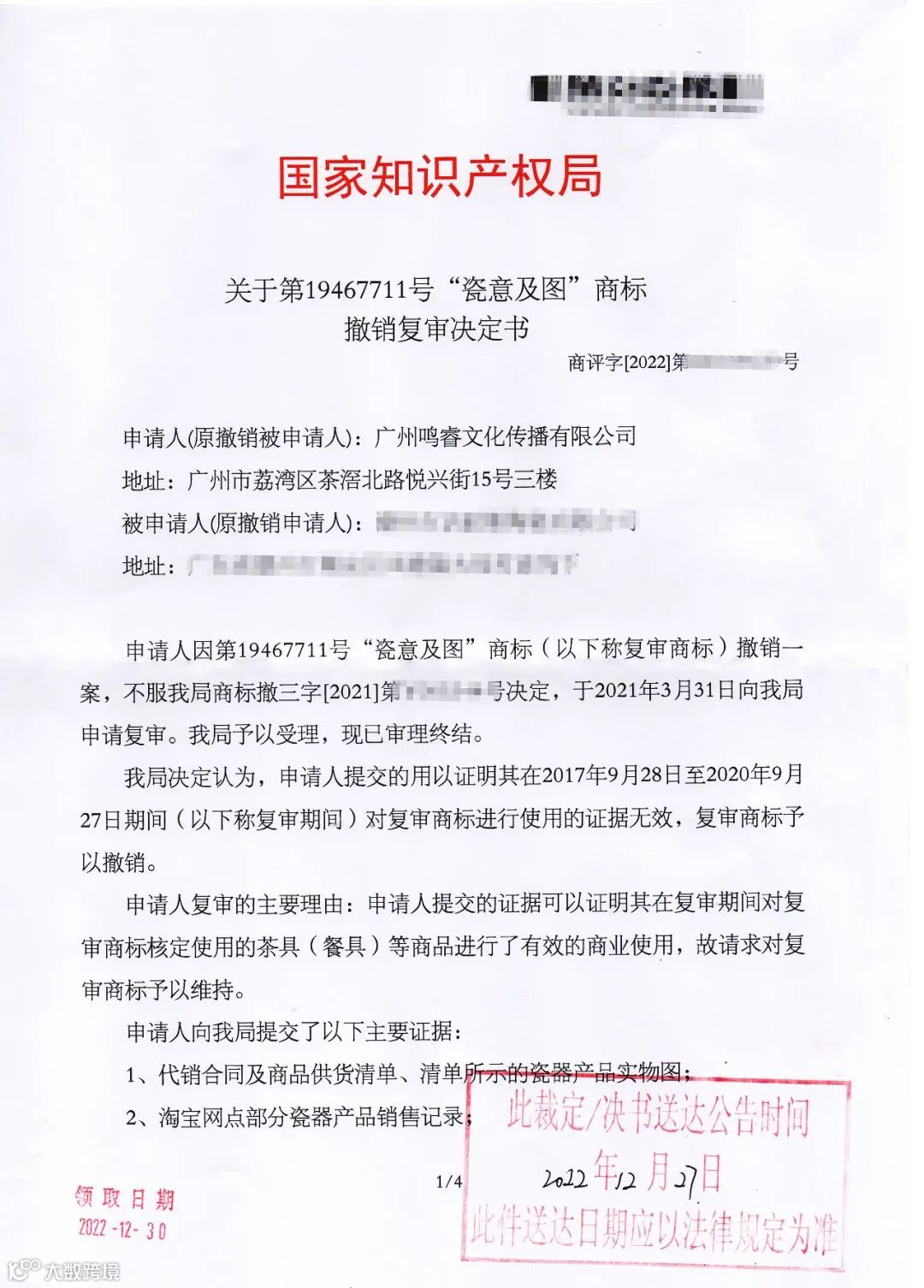 (图1:国家知识产权局商标撤销复审决定书,图片由谭广辉先生提供)