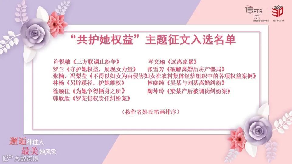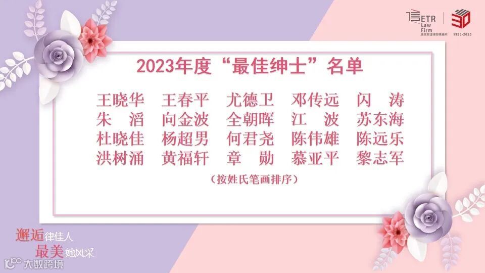 三月的春风惹人醉,三月的桃花为卿开。为鼓励先进、宣传典型、树立榜样,通过个人自荐、组织推荐,经初核、复核及公示程序,本所评选出2023年度“十大律政佳人”。