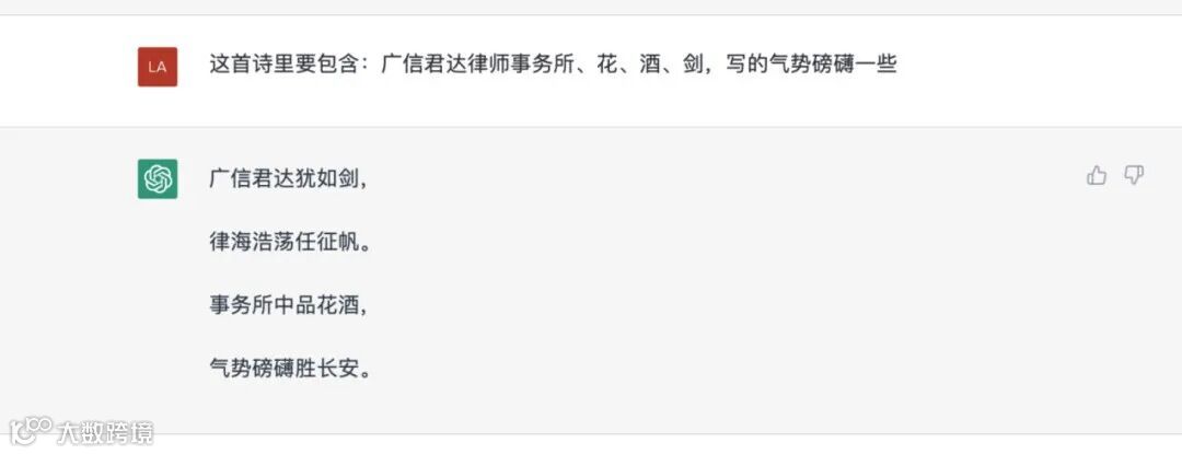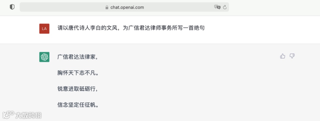 ChatGPT“创作”基于大规模预训练的自动化文本生成技术,利用大量的语料库来获取丰富的语言知识,并通过这些知识来生成各种类型的文本和对话。在这种生成方式下,不需要人工干预,只需要提供一些基础的指令或关键词,ChatGPT就能够生成符合要求的文本内容。因此,ChatGPT的创作方式具有高度的自动化和智能化,能够快速地生成大量的文本作品。例如,输入指令:“请以唐代诗人李白的文风,为广信君达律师事务所写一首绝句”, ChatGPT便自动生成了如下图所示的一首诗。