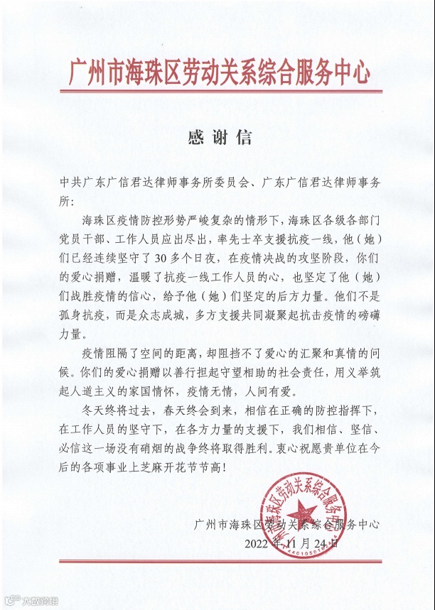 这段时间,广州面临抗疫三年以来最复杂、最严峻的疫情。广信君达律师事务所及律师员工响应广州市律师协会倡议,积极承担社会责任,参与防疫工作和保障服务,为筑牢疫情防控坚固防线、打赢疫情防控提供社会支持,贡献广州市律师行业力量。