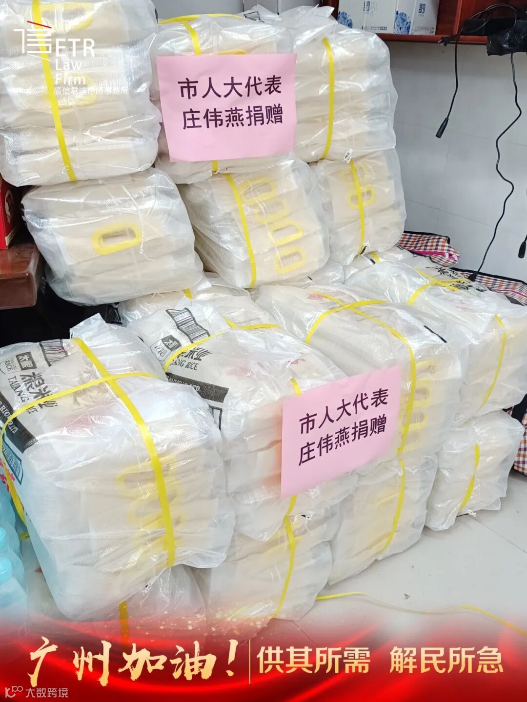 广州市人大代表、我所党委副书记庄伟燕律师在了解到部分疫区居民生活物资需求紧缺后,第一时间响应,第一时间行动,当即向广州市天河区棠下街捐赠了大米1000斤,为处于封控区的群众生活物资供应提供一定保障。